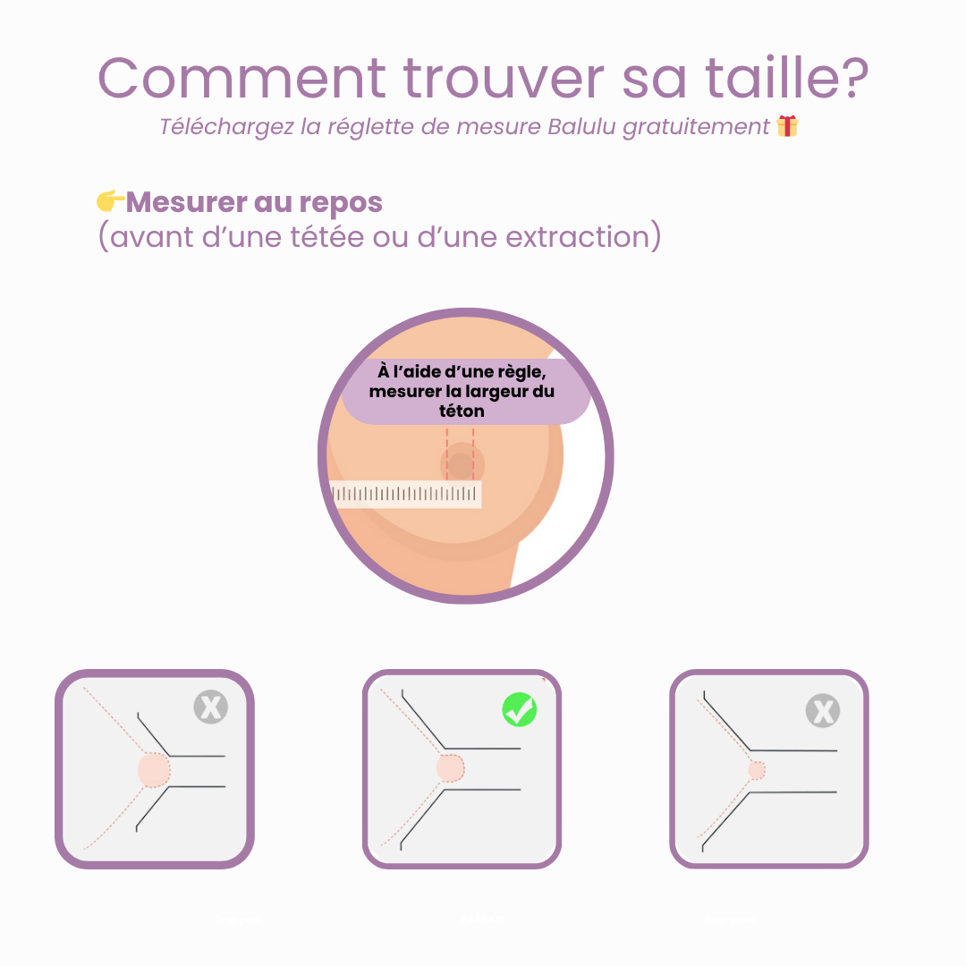 Téléchargez gratuitement la règle de mesure du mamelon Balulu et trouvez l’insert parfait pour votre tire-lait. Une taille bien ajustée permet :