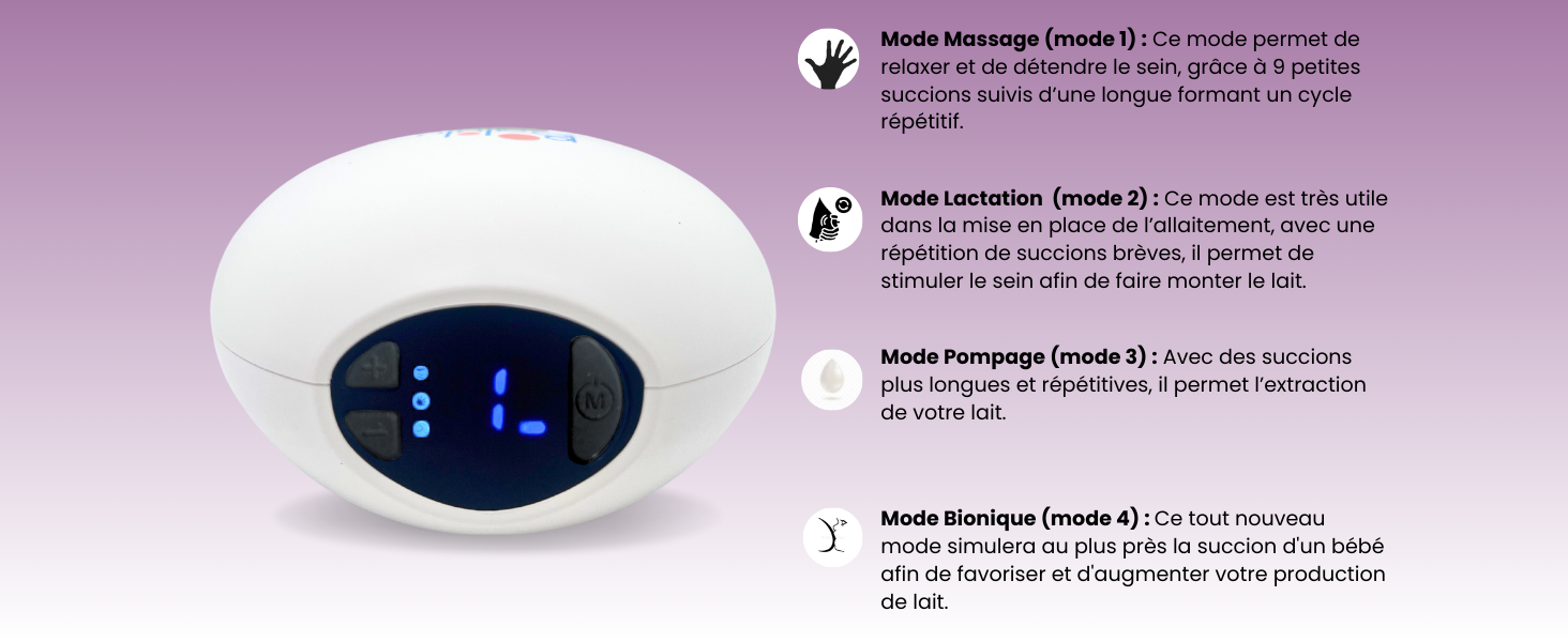 Il offre une aspiration équilibrée, idéale pour maintenir votre lactation tout en privilégiant la discrétion (273 mmHg)